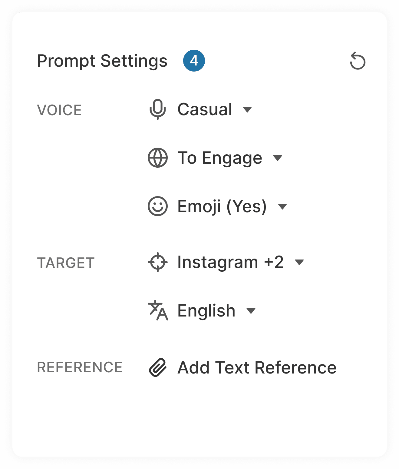 Compact prompt controls for tone, target, platform, and more.